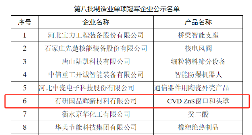 有研国晶辉将以此为契机,积极发挥国家制造业单项冠军企业的示范引领作用,在红外光学和半导体领域继续深耕,加快科技创新,促进产业发展,为建设制造强国提供有力支撑。