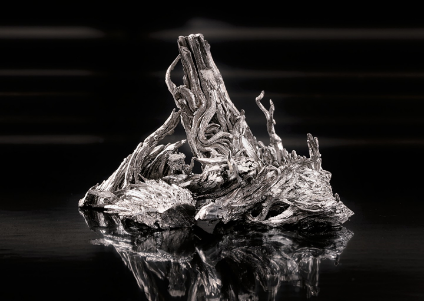 块状或针状结晶,呈银白色金属光泽。