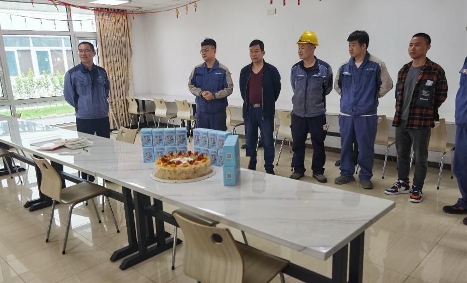为表达公司对职工的关心关怀,对职工长期以来辛勤工作表示肯定,使职工感受到有研稀土大家庭的温暖, 4月28日,有研稀土在燕郊基地职工食堂举办了一场别开生面的集体生日会。有研稀土党总支委员、副总经理王志强出席活动,驻厂四月份过生日的职工20余人参加活动。因为疫情原因,部分职工不能和家人团聚过生日,公司在厂区为他们举办集体生日,职工们感到既兴奋又惊喜。