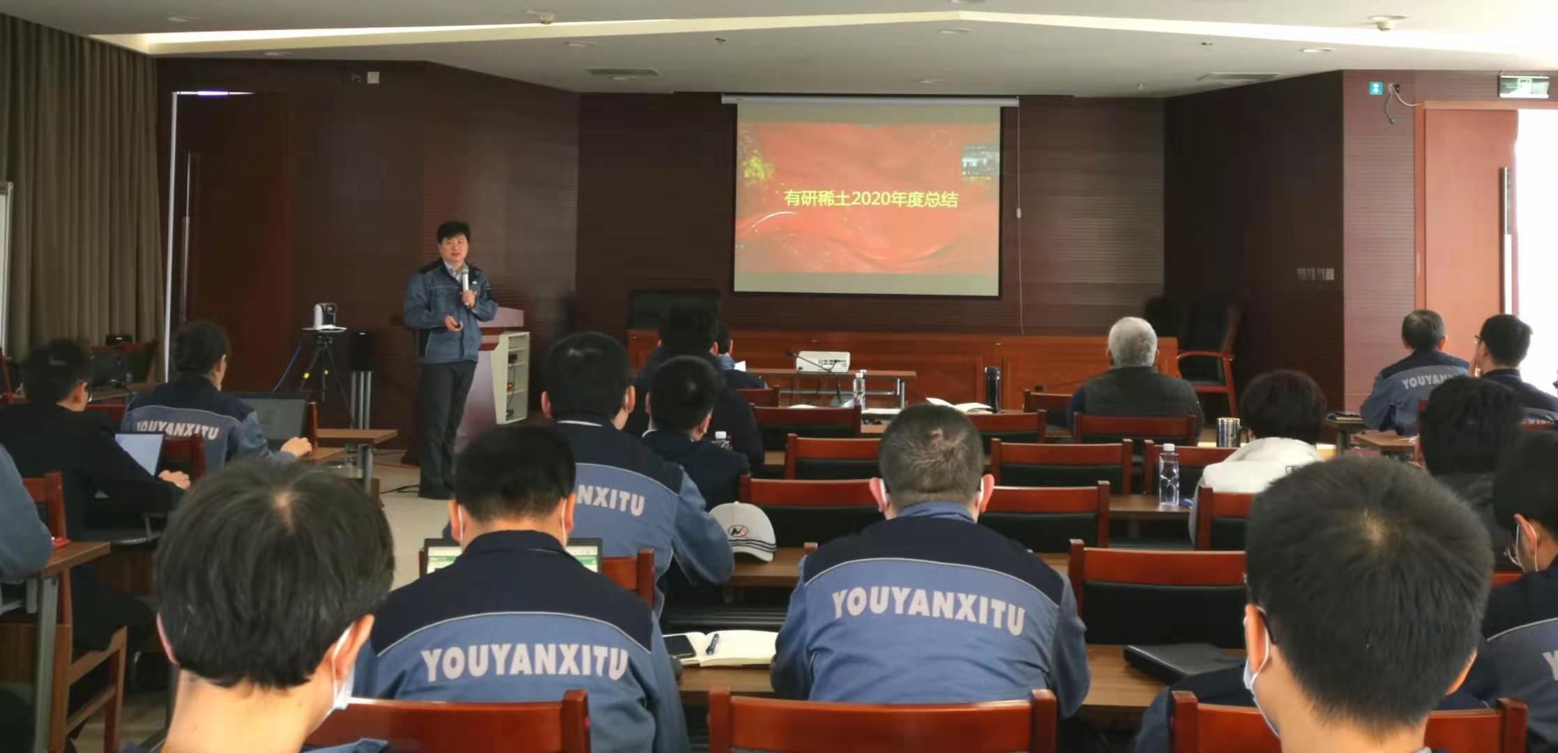 总结展望|党总支书记、总经理于敦波首先做《有研稀土2020年度工作总结》报告。回顾2020年,有研稀土积极抗击疫情,最早复工复产,全面完成了经营业绩指标,创新、发展、团结成为2020年度三个“关键词”。总结“十三五”,有研稀土取得了辉煌成就:一是高层次人才队伍不断发展壮大,黄小卫当选为中国工程院院士、亚太材料科学院院士,其他获评各类国家及省部级人才称号20余人次。二是科技创新硕果累累,共获得省部和行业科技成果奖励24项,碳酸氢镁法分离提纯稀土原创技术、离子型稀土矿浸萃一体化新技术等绿色技术在六大稀土集团广泛推广,技术领跑全球,引领稀土行业绿色革命;高纯稀土金属及靶材满足高端应用;稀土磁性材料、发光材料、催化材料等新产品层出不穷,引领行业发展。三是产业布局更加完善,新增4家子公司,8个平台资质,磁板块实现战略落地。四是企业形象显著提升,新的研发和产业基地落成并投入运营,工作环境明显改善。面对错综复杂的经济形势,有研稀土坚持稳健经营,始终坚持科技创新,壮大产业发展,努力满足员工对美好生活的向往。