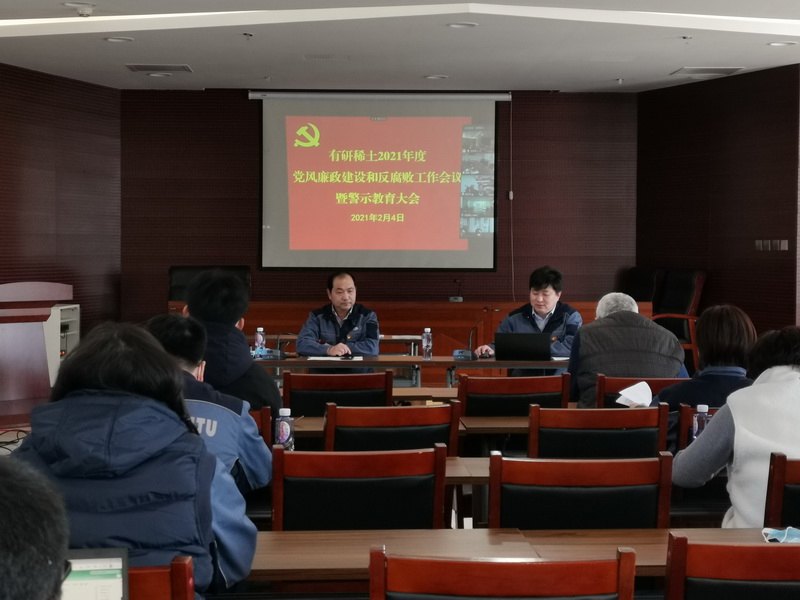 2021年2月4日,有研稀土2021年度党风廉政建设和反腐败工作会议暨警示教育大会在燕郊基地召开。英国365集团公司党委委员、纪委书记刘慧舟视频参会并讲话,公司党总支书记、总经理于敦波做警示教育讲话,公司领导班子成员、各党支部委员、中层管理人员以及关键岗位人员50余人在现场参加会议,各子公司高管、支部委员等视频参会。公司党总支副书记、副总经理许国栋主持会议。