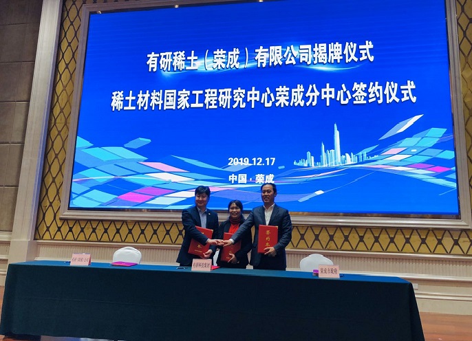 为有效延伸稀土产业链、做强做大主营业务板块,有研稀土与朱口集团(荣成宏秀山磁业有限公司和青岛麦格耐特科技有限公司)强强联合,在威海、青岛两地分别投资成立有研稀土(荣成)有限公司、有研稀土(青岛)有限公司,并设立稀土材料国家工程研究中心荣成分中心——有研稀土(荣成)磁性材料研究院。研究院将围绕电声音响、5G通讯、物联网等高端应用市场需求,重点开发新能源汽车、智能电子器件、机器人等领域用高端稀土磁性材料、器件及应用技术,打造一流的稀土磁性材料研发及创新平台;充分发挥在高端稀土材料工程化技术开发、成果转化、辐射推广等方面的先导作用,依托有研稀土荣成、有研稀土青岛两家公司,进一步夯实在手机扬声器、受话器、智能音箱、汽车音箱等消费电子用磁体的既有优势,并择机布局新能源汽车、5G通讯等高端应用领域,推动稀土磁性材料产业的跨越式发展,为实现中国稀土强国梦贡献更多的智慧和力量。