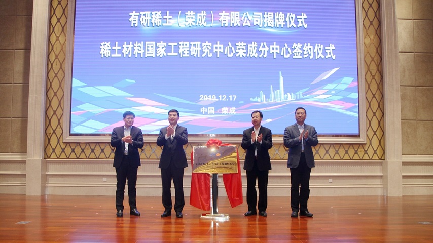 12月17日,有研稀土(荣成)有限公司揭牌暨稀土材料国家工程研究中心荣成分中心签约仪式在山东威海荣成市隆重举行。有研集团党委书记、董事长赵晓晨、总经理熊柏青、威海市市长张海波、荣成市市委书记包希安共同为合资公司揭牌。有研稀土黄小卫院士、有研稀土(荣成)公司董事长于敦波、荣成市副市长王刚分别代表各方就设立稀土材料国家工程研究中心荣成分中心签约。