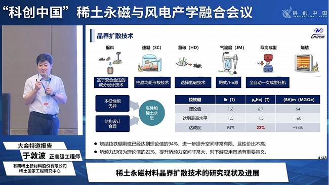 有研稀土15名科研人员做了会议报告,分享本领域的最新研究成果。其中于敦波正高级工程师在“科创中国”稀土永磁与风电产学融合会议上做了题为《稀土永磁材料晶界扩散技术的研究现状及进展》的大会邀请报告,杨娟玉、刘元红、余金秋、赵龙胜、吴道高分别做了题为《高端显示玻璃基板用CMP镧铈基稀土抛光材料及其应用关键技术》《高品质照明与显示用红色荧光粉的信赖性提升研究》 《闪烁晶体用高纯无水稀土卤化物——现状与展望》 《离子型稀土矿硫酸镁选择性强化浸取过程调控》 《高纯金属铒的热变形行为及组织演变》的分会场邀请报告。