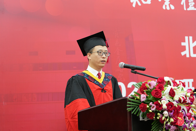 博士毕业生王承二代表全体毕业生对各位领导和老师的悉心栽培表达诚挚的感谢。他回顾了求学生涯的难忘经历,分享了对有研精神的感悟。他表示,历久弥新的有研精神、言传身教的人格魅力,是有研学子坚定理想信念、坚守精神追求的信仰之基,是有研人共同构筑理想人格的价值坐标,将成为人生路上的重要指引。