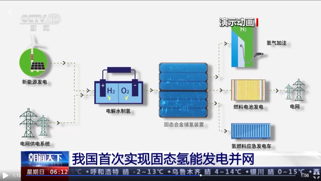 3月25日,由中国有研所属有研工研院与有研广东院联合自主研发设计制造的规模储氢装置与分级静态氢压缩装置成功应用于南网云南综合能源站与广州南沙电氢智慧能源站。这是我国首次将光伏发电耦合固态储氢应用于电力系统,同时也是国内首次实现固态储供氢增压加氢及发电综合应用,实现了“绿电”与“绿氢”灵活转换。该进展被中央电视台新闻联播及朝闻天下关注与报道。