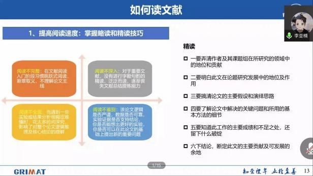 李亚楠从“为什么要做文献综述”“如何查文献”“如何读文献”“如何总结文献”和“如何写文献综述”五个方面分享了文献阅读与综述的经验技巧,也为即将面临学位论文选题的研究生详细介绍了文献综述写作经验,并通过指导研究生的经验介绍了研究生在文献综述中常见的几类问题。就文献调研与综述向研究生提出了三点建议:一是多读文献,阅读经典文献与最新文献,学习永无止境;二是多总结,重视锻炼自己的文献综述与逻辑思维能力;三是多交流,三人行必有我师,老师、同学、外部同行都会对自己的学术能力有所助益。